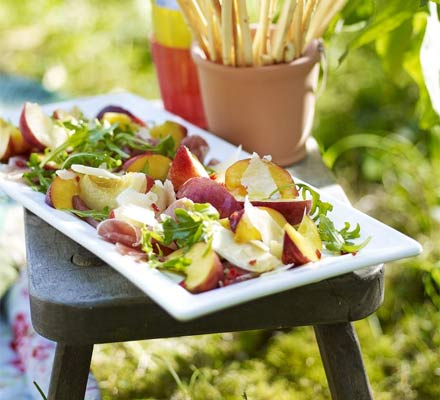 Arrange the peaches, prosciutto and Parmesan on a large platter, sprinkle over the chilli and scatter the rocket to finish. Just before serving, drizzle with a little oil. Serve with breadsticks to add crunch.