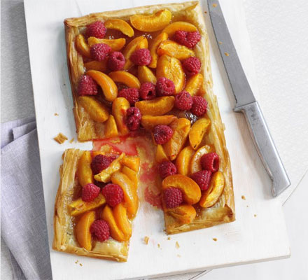 Remove from oven, arrange apricots over the tart and brush with any leftover melted butter. Bake for another 10 mins, then scatter on raspberries and sprinkle with sugar. Bake for a final 10 mins until the pastry is golden brown and crisp.