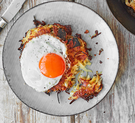 This super-simple recipe with melted cheese and crisp black pudding makes a good brunch or supper and is a great way to use up leftover potatoes