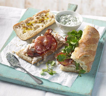 Split the baguettes in half lengthways and brush the insides with the juices from the bacon pan, then pile the chicken and bacon inside. Top with a handful of watercress, then finally add a good spoon of the watercress crème fraîche before you tuck in.