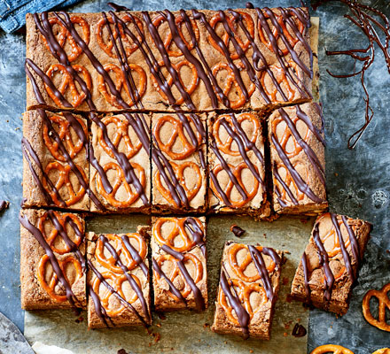 Spoon half the mixture into the tin, add the peanut butter in dollops to cover the surface, then top with the remaining dough. Use your fingers to press everything down, but don’t worry about it looking too neat. Arrange the pretzels on top and bake for 50 mins until the dough is set and crisp on the surface. Leave to cool in the tin to room temperature before cutting.