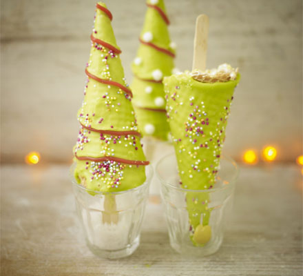 Melt the marshmallows and golden syrup in a pan, then stir in Rice Krispies. Working quickly, pack the mixture into ice cream cones and push a lolly stick into the middle of each one. Chill the cones for 1 hr until completely firm. Mix icing sugar with green food colouring and enough water to make a thick icing. Dip the cones into the icing and decorate with sweets and sprinkles. Prop up on a wire cooling rack to set.