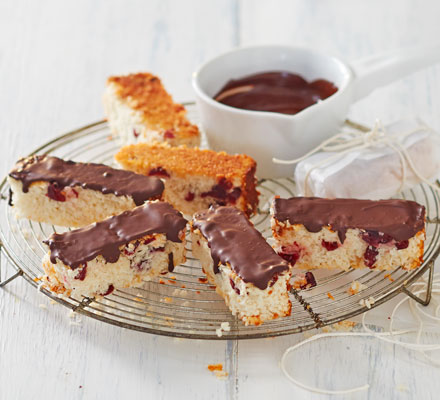 Melt the chocolate in a bowl over a pan of barely simmering water, or in short bursts in the microwave. Cut the coconut bake into 12 or 16 bars and remove the baking parchment. Turn the bars upside down and carefully spoon a little of the melted chocolate onto the base of each one, spreading with a knife to cover. Leave to set (pop in the fridge to speed it up if you like), then wrap the bars individually in baking parchment. Will keep in the fridge for up to 5 days.