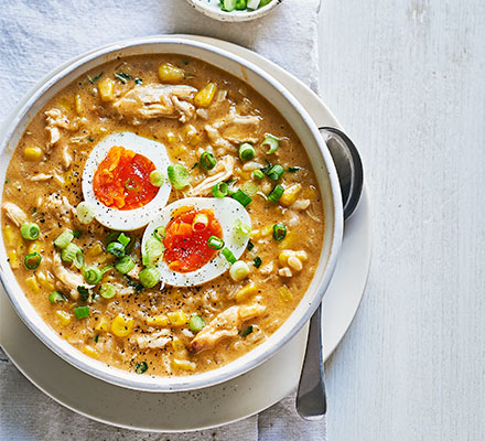 Bring a pan of water to a simmer, add the eggs and cook for 7 mins. Stir the chicken and sweetcorn into the soup and cook for 5 mins to warm everything through. Season to taste and finish with the lime juice. Gently peel the shells off the eggs and cut them in half. Top the soup with the eggs and spring onions.