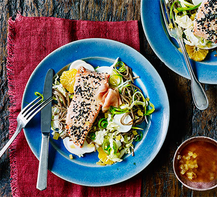 Cook the noodles following pack instructions, then drain and tip into a bowl. Meanwhile, heat the grill. Mix together 1 tsp sesame oil with 1 tsp ginger syrup and brush over the salmon fillets. Sprinkle on the sesame seeds to stick, then grill for 5-8 mins until just cooked through.