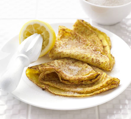 This simple batter, based on equal volumes of eggs, milk and flour, produces thick pancakes, ready for your favourite fillings