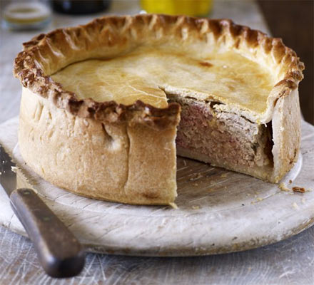 Put filling in the pie case and push down well. Brush the pastry case’s edges with a little water and cover with the lid. Crimp the edges together and brush the whole with the beaten egg. Bake for 1 hr then turn off the heat and allow the pie to cool in the oven for 30 mins. Remove from oven and cool for 1 hr before eating.