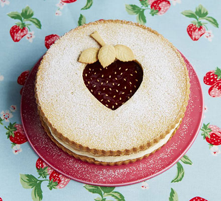 Start assembling the shortcake. Place the shortbread biscuit without the heart cut-out on a plate or cake stand, pricked-side up. Starting in the centre, pipe on the buttercream in a spiral, working your way towards the edge. Lay the cake on top of the buttercream, then spoon the jam on top of the cake and carefully spread out over the surface.