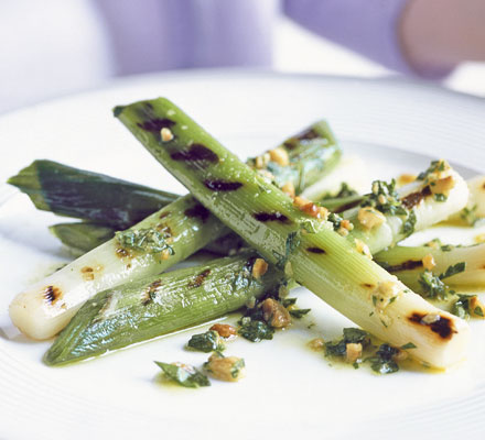 To serve, heat a griddle or frying pan and toss the leeks in some oil. Griddle batches for 1 min on each side until slightly charred and warmed through, then put onto 4 plates. Stir the parsley into the nutty dressing, spoon over and serve.
