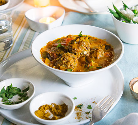 Stir the remaining coconut milk into the sauce over a low heat, then add the chopped coriander. Sit the meatballs in the sauce and cook for 5 mins on a very gentle simmer to warm through and blend the flavours, then remove the cinnamon stick.