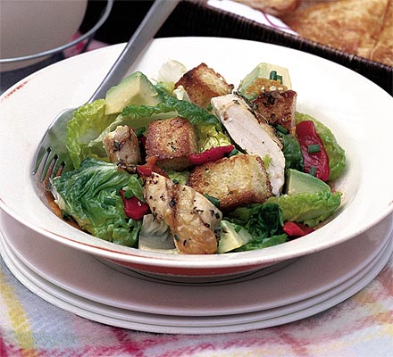 Lift out the chicken and thickly slice. Stir the remaining lemon juice and the olive oil into the tin, scraping up any nice brown bits from the bottom. Place the chicken in a very large serving bowl with the lettuce leaves, avocado, croûtons, peppers and chives. Add the lemony juices, toss well together, then serve just warm.