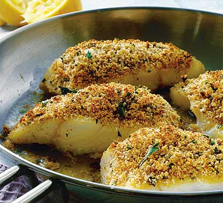 Season the 4 skinless fish fillets. Pan fry in a little oil for 2-3 minutes until just tender. Turn over and sprinkle with the crumb mixture. Brown in the pan under a hot preheated grill for 2-3 minutes. Add the butter to the pan with the juice of 1 lemon. Melt around the fish and serve.