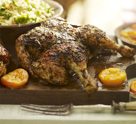 Come rain or shine, serve up this sumac-marinated spatchcocked bird, that can be barbecued or oven cooked, with a sweet, fruity accompaniment