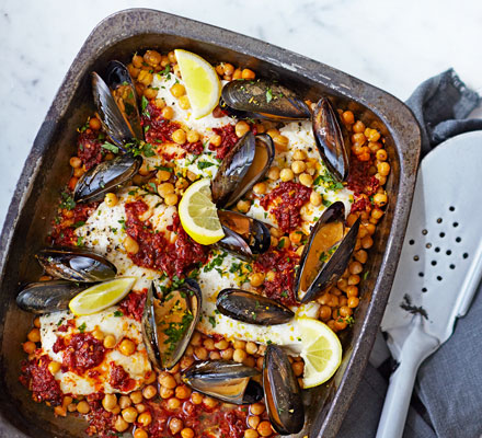 Cover the tin tightly with foil and put in the oven for 15-20 mins until the fish is cooked and the mussels have opened – discard any that stay shut. Gently lift the fish onto serving plates. Scatter the mussels and chickpeas with the parsley and lemon zest. Drizzle with olive oil, give it all a good stir and serve with the fish and lemon wedges for squeezing over.