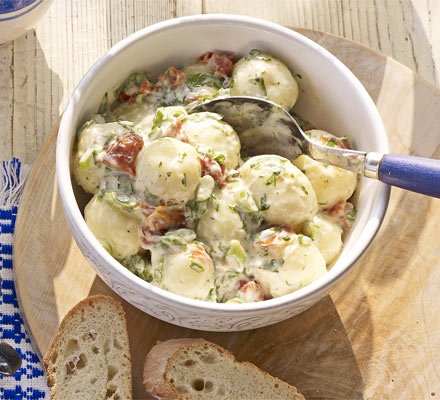 Add the potatoes and coat in the creamy dressing, trying not to break up the potatoes. This can be made a day ahead and stored in the fridge.