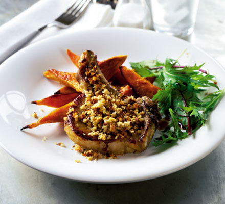 Meanwhile, whizz together breadcrumbs, garlic and mustard in a food processor, then season lightly. Lightly oil a baking tray with the oil spray, place the chops on top and sprinkle some of the breadcrumb mixture over each chop. Spray with a little more oil, then bake for 20 mins until the meat is cooked through and the topping is golden. Serve with the sweet potato wedges and mixed leaves, lightly drizzled with vinaigrette if you like.