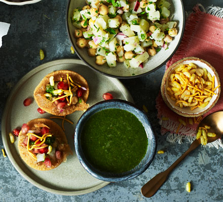 This deep-fried Indian street food makes a great party snack – crisp rounds of bread filled with chickpeas and potato, drizzled with a herb and spice water