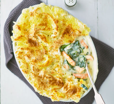 A simple potato-topped seafood pie that's quick to make, using king prawns, fresh baby spinach and shop-bought cheese sauce for convenience