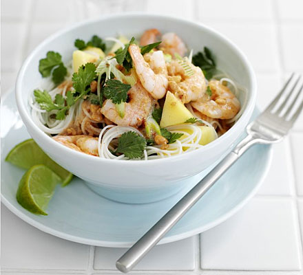 Pour boiling water over the noodles, leave for 4 mins, then drain and cool under cold running water. Drain well. Halve the mango either side of the stone, then peel each half and chop the flesh. Mix with the noodles, prawns, spring onions and coriander.