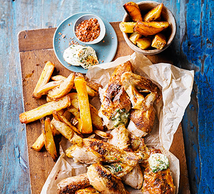 Remove the chicken from the oven and leave to rest for 5 mins. Cut the chicken into portions and place on a platter with slices of the butter melting over each portion. Serve with the chips and the remaining chicken salt.