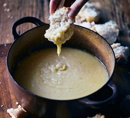 This easy, indulgent cheddar and Gruyère fondue has a splash of white wine and kirsch for a super simple treat to share with friends