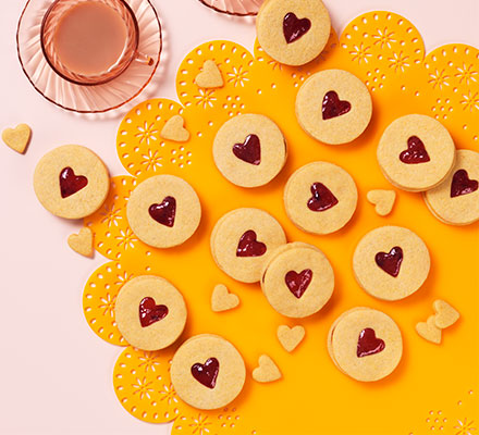 Cut circles or hearts out of the centres of half the biscuits using the wide end of a plain piping nozzle (about 1.5cm), or a small heart cutter. Transfer all the biscuits to lined baking sheets, then transfer to the fridge and chill for 15 mins. You can also cook the cut-out shapes to make mini biscuits – if doing so, put these on their own baking sheet.