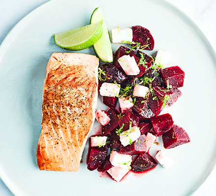 Season the salmon. Heat 2 tbsp of oil in a nonstick frying pan over a high heat. When hot add the salmon, skin-side down, and cook for 3 mins. Flip over, turn the heat down and cook for a further 4-5 mins. Serve with the beetroot salsa and the remaining lime, cut into wedges.