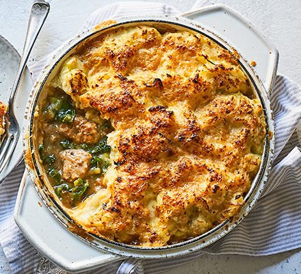 Mash the potatoes until smooth. Stir though the leeks, mustard and milk, and season. Spoon and swirl the mash on top of the sausage mixture, then scatter over the grated cheese and grill for 3-5 mins or until golden and bubbling.
