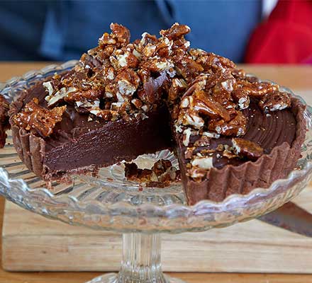 Bake this sophisticated dessert to end your dinner party on a high. A chocolate pastry crust is filled with unctuous ganache filling and topped with caramelised salted pecans