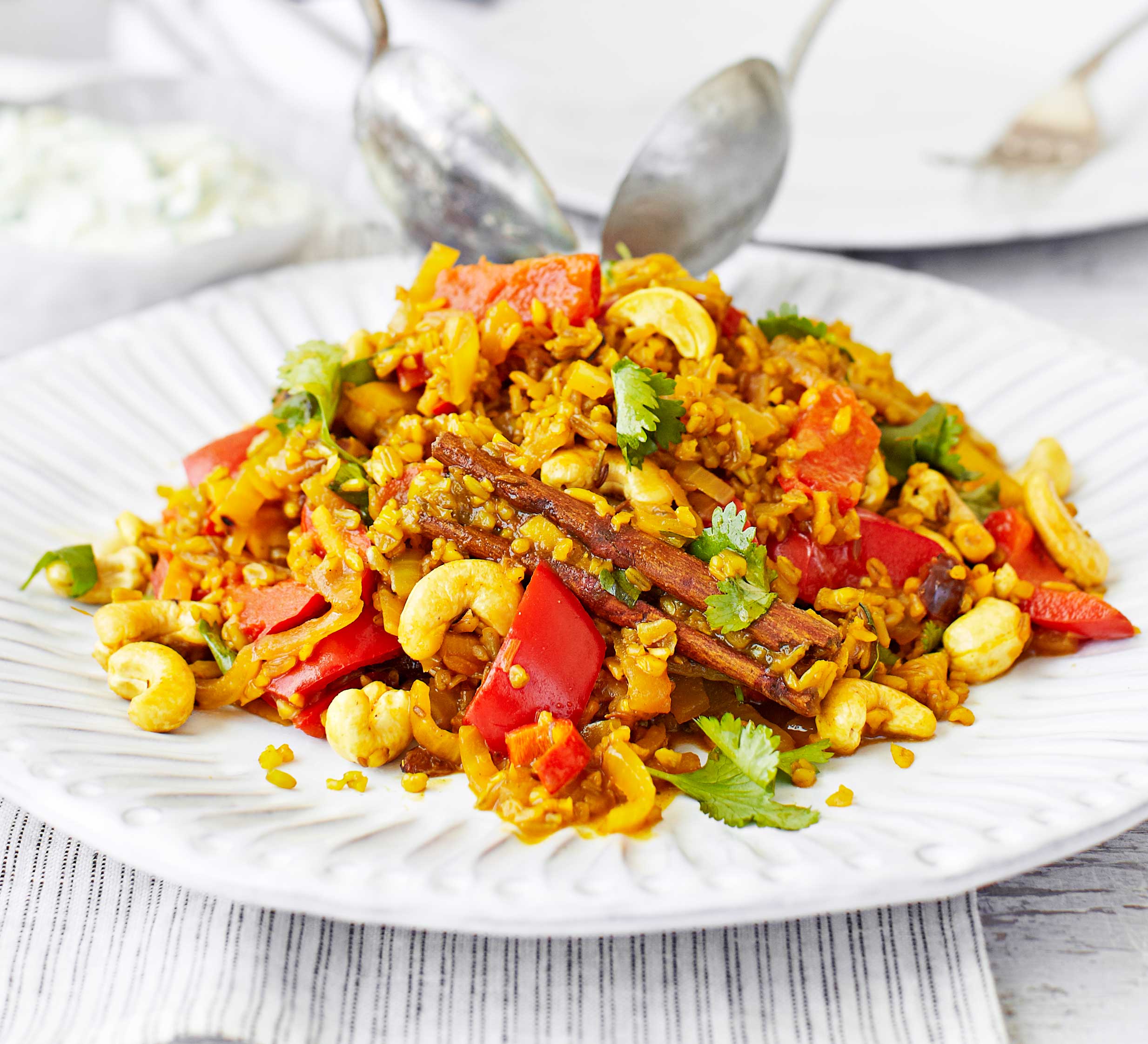 When the pilau is cooked, stir in the coriander and cashews, and serve with the raita.