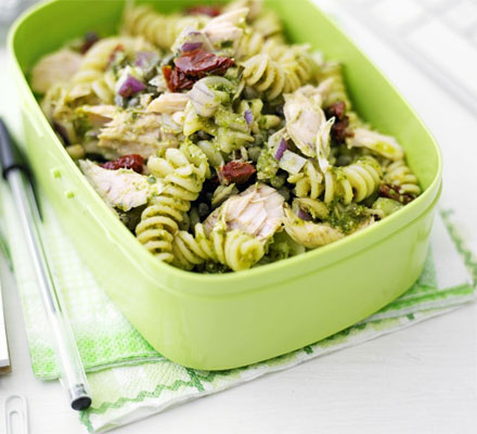Make it for kidsMix together 1 tbsp pesto with 2 tbsp mayo. Stir through 100g cooked pasta along with 100g sweetcorn, 185g can drained, flaked tuna and 1 chopped tomato.Dress it up - Griddled tuna salad
