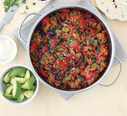 Heat the tortillas following pack instructions and serve with the chilli, avocados, onion and a dollop of mayo.