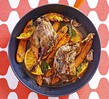 Heat the oven to 200C/180C fan /gas 6. Scrape away any excess fat from the duck (you could keep this for duck fat potatoes), but keep any jelly. Put the carrots, garlic and orange wedges into a large roasting tin, then toss with the oil and season well. Season the duck legs, then sit them on top of the veg, skin-side up. Roast for 40 mins until the carrots are tender and the duck is turning golden.