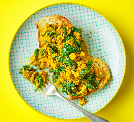 Whisk the eggs with the coconut milk and turmeric. Season well. Add to the pan with the spinach and stir continuously for 5-8 mins until the scrambled eggs are at the desired consistency. Serve on slices of toasted sourdough.