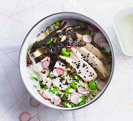 Toss the rice with the edamame and radishes. Top with the sesame seeds, chicken and seaweed, then drizzle over the dressing to serve.