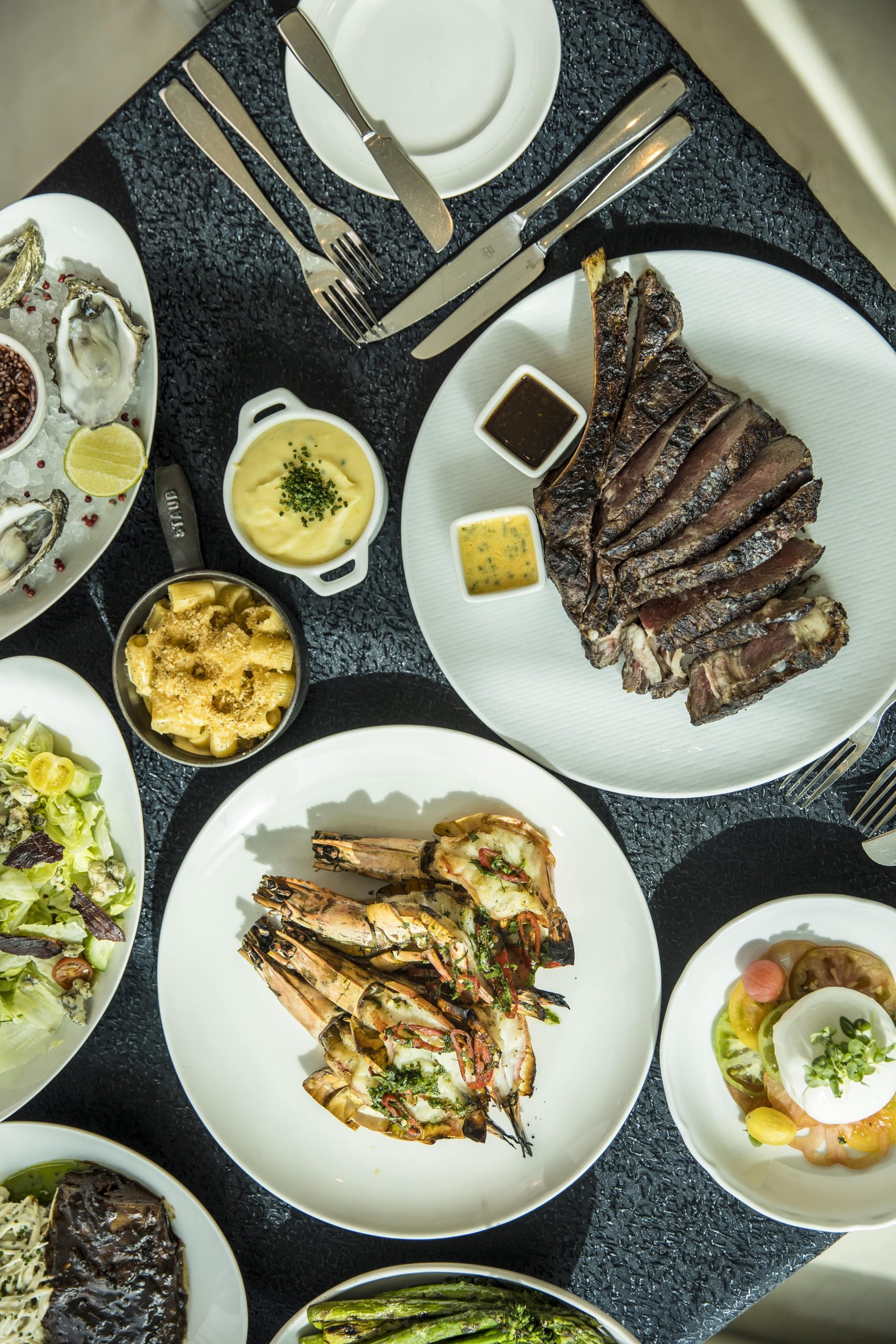 The mains continued with the USDA Prime New York Striploin cooked to perfection and accompanied by a luscious bearnaise sauce. The Grilled jumbo prawns with chimichurri were juicy and perfectly seasoned, and the Crisp corn-fed chicken with bourbon peppercorn added a comforting touch to the spread. The sides were equally indulgent; featuring the truffle mac & cheese, french fries, and grilled greens to complement our rich mains.