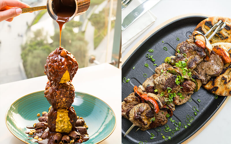Mains are divided into grills, “traditionally flavoured”, and sharing platters. We try the chicken souvlaki skewers (though there is also the choice to have beef tenderloin or minced lamb, should you prefer) which is served on a sizzling platter to the table alongside charred veg and tzatziki. The chicken is well-cooked and has that smoky, just-off-the-barbie finish to it. We also try the grilled lamb rack from the sharing platter, which I cannot recommend enough if you’re a truffle lover (the aromas are enough to excite us before the dish even arrives at our table.) The lamb is tender and well-seasoned and sits atop a bed of mouth-watering wild mushroom risotto, finished with truffle oil and grated graviera. My advice: do not miss this!