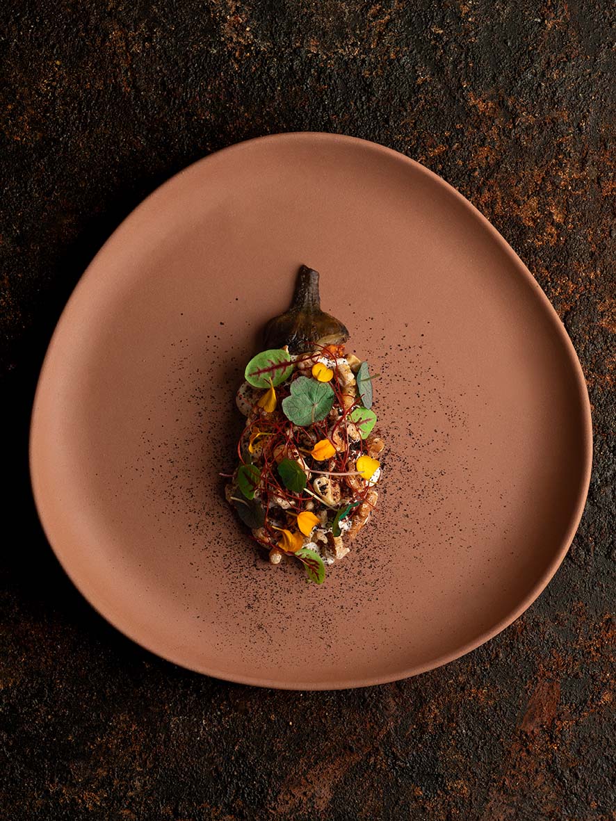 The Umami éclair is a tiny powerhouse. A porcini emulsion and marmite burst onto the palate, sweetened by fermented quince glaze. Crunchy cacao nibs and salty beef prosciutto not only add texture but also evolve the flavour profile. Every ounce of flavour is crammed into the first bite of the Ajoblanco as you take a spoonful of the firm and sweet Hokkaido scallop and scoop the sauce embellished with slivers of black garlic, bold tomato raisins and tart finger lime. It’s the olive oil caviar that does it for us. The Orfali bayildi featuring tender, smoky eggplant, showcases a multi-layered complexity with the makdous muhammara, tarator and accompanying aromatic elements.