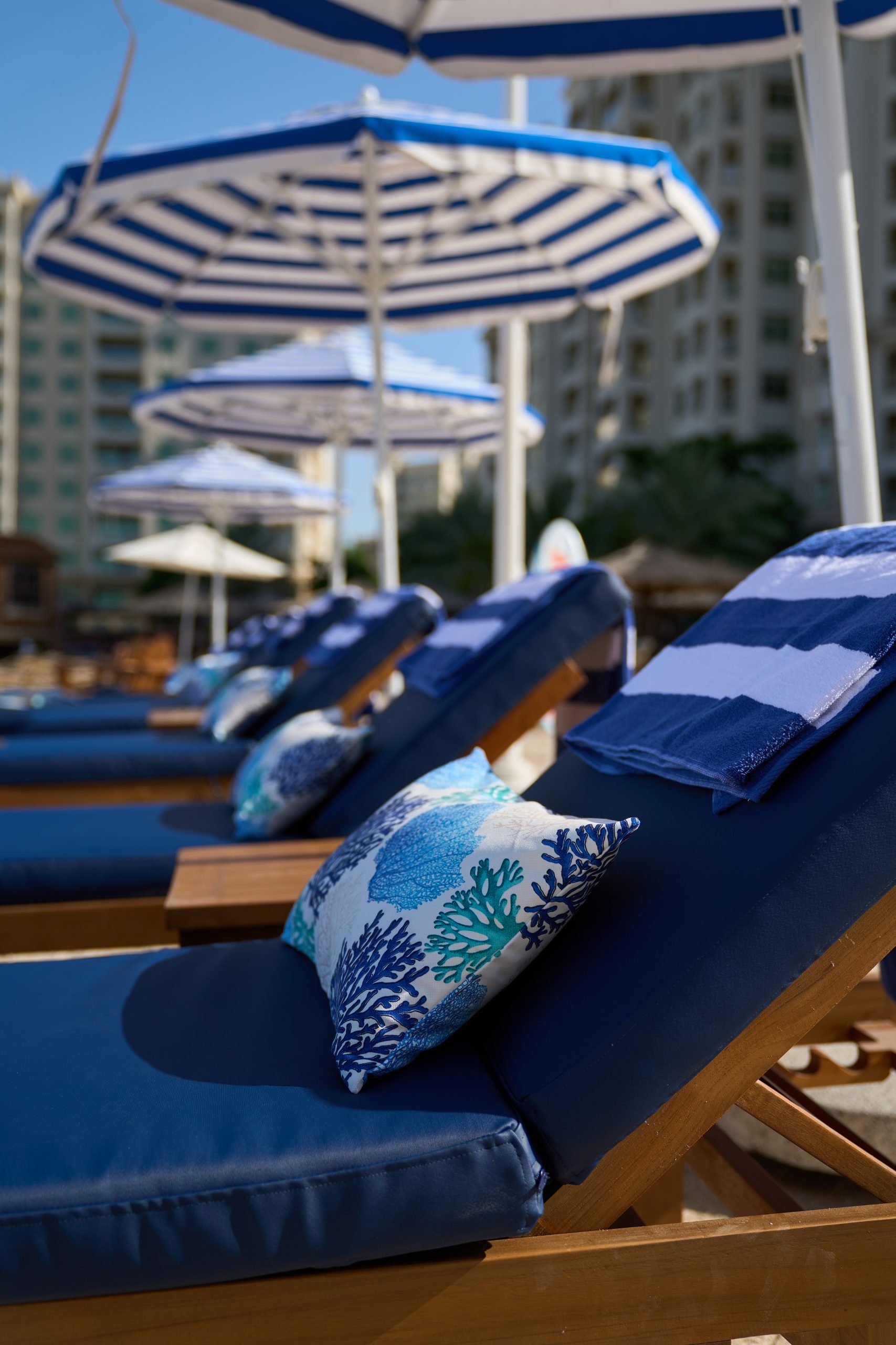 The restaurant’s ambience is modern and coastal, with calming blues and whites that complement its beachfront location. Diners can choose between pergola seating, poolside lounging, or sunbeds with views of the Arabian Gulf and the Burj Al Arab.