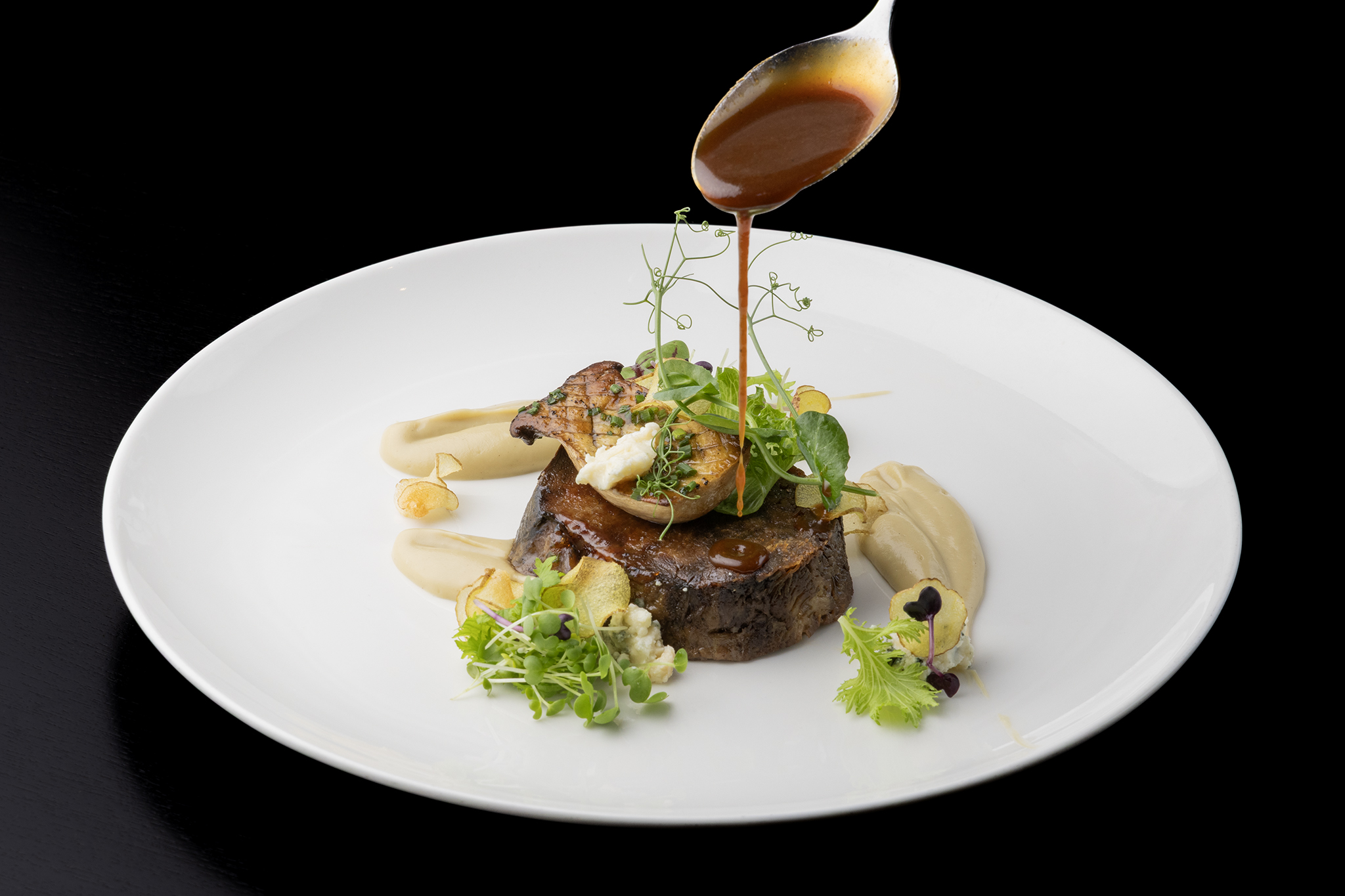 For mains, the 1.2kg 300-day grain-fed Black Onyx Angus Tomahawk was carved at the table, presenting juicy, deeply beefy meat with a natural, smoky char. The grilled asparagus with miso butter added a savoury, umami note, and the truffle mashed potatoes were earthy and creamy. Of the sauces, the creamy mushroom was rich and nutty, the peppercorn offered a mild heat and aromatic spice, and the caramelised shallots with herb jus brought a savoury-sweet layer with fresh herbal hints.