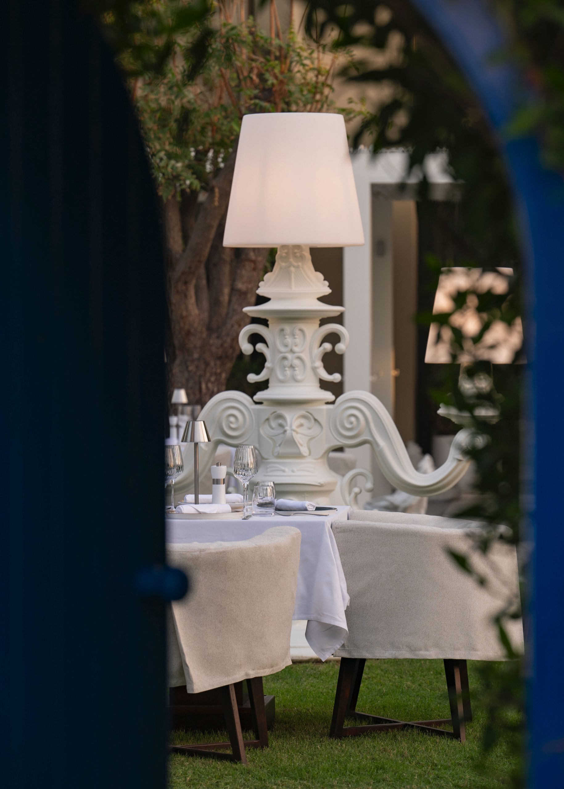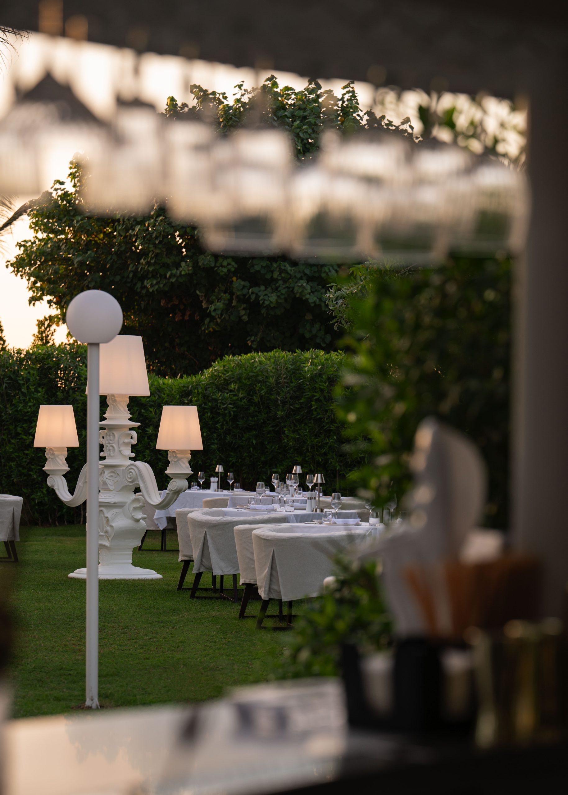 Dinner at Blue Door took place in the gardens, where round tables dressed in white linen are arranged under trees, creating an open and peaceful outdoor space. The dining room inside follows a similar tone, with soft lighting and curved seating. After the meal, we also headed out to Rose Bar, where the all-over rose-coloured lighting casts a warm glow across the space.