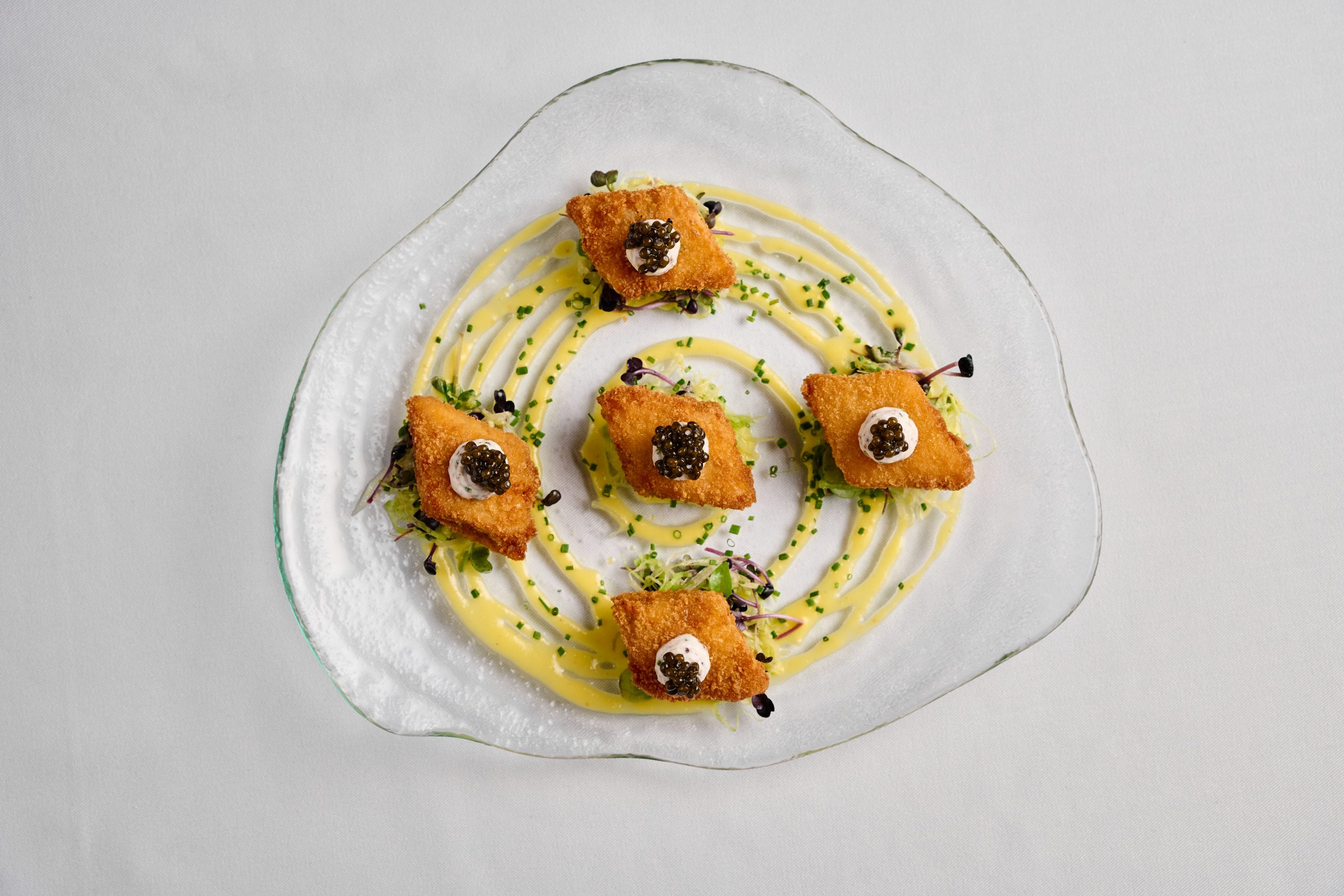 Next comes a playful dish: Crispy chicken bites topped with caviar and a decadent truffle cream, giving fast-food nostalgia a gourmet edge. The Aubergine parmigiana is a showstopper, served whole and sliced between to reveal layers of parmesan, mozzarella, tomato fondue, rocket pesto, and creamy parmesan sauce. It is rich, comforting, and surprisingly fresh. For the adventurous, the warm Snails in parsley butter are tender and aromatic, offering a bold, garlicky nod to French tradition.
