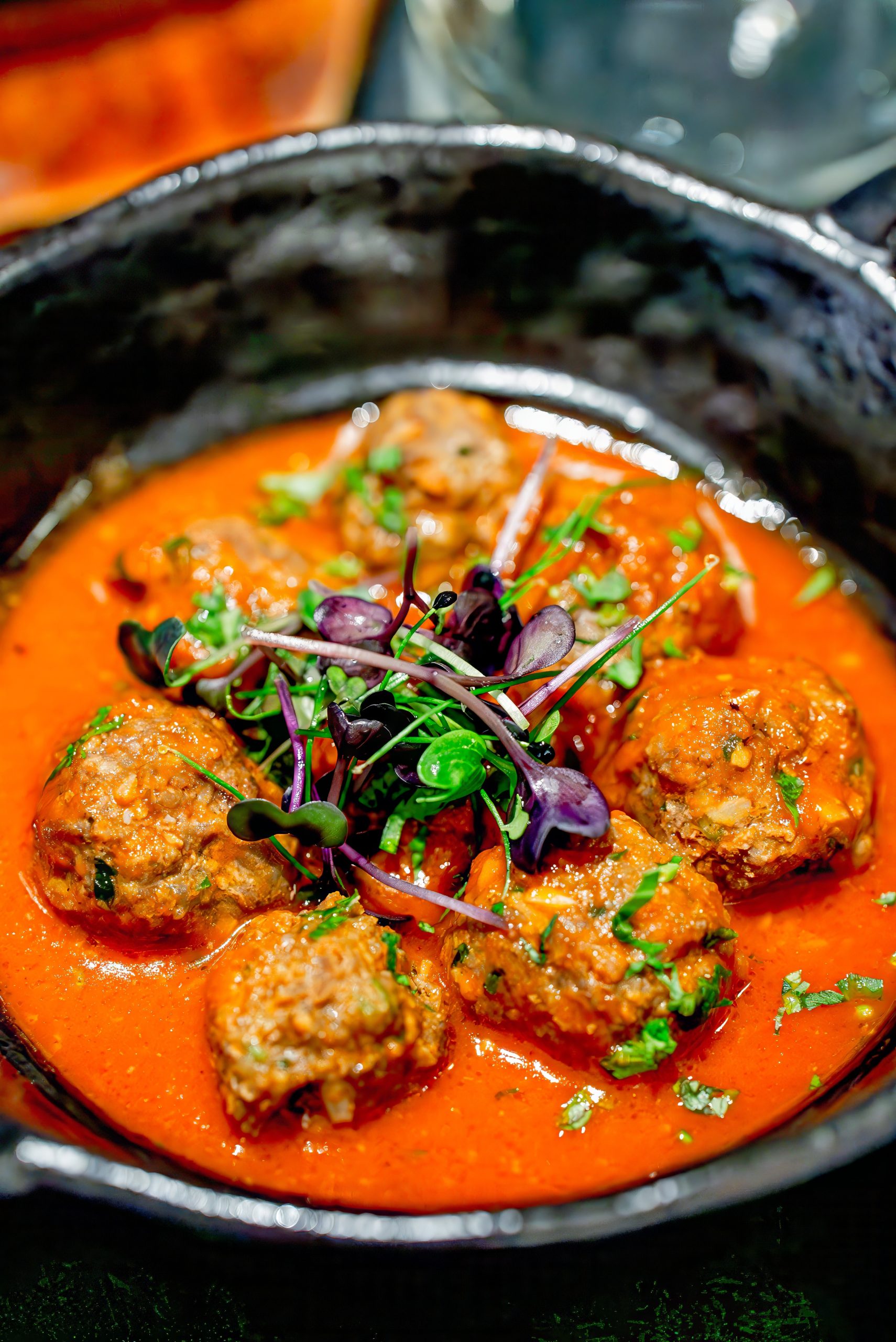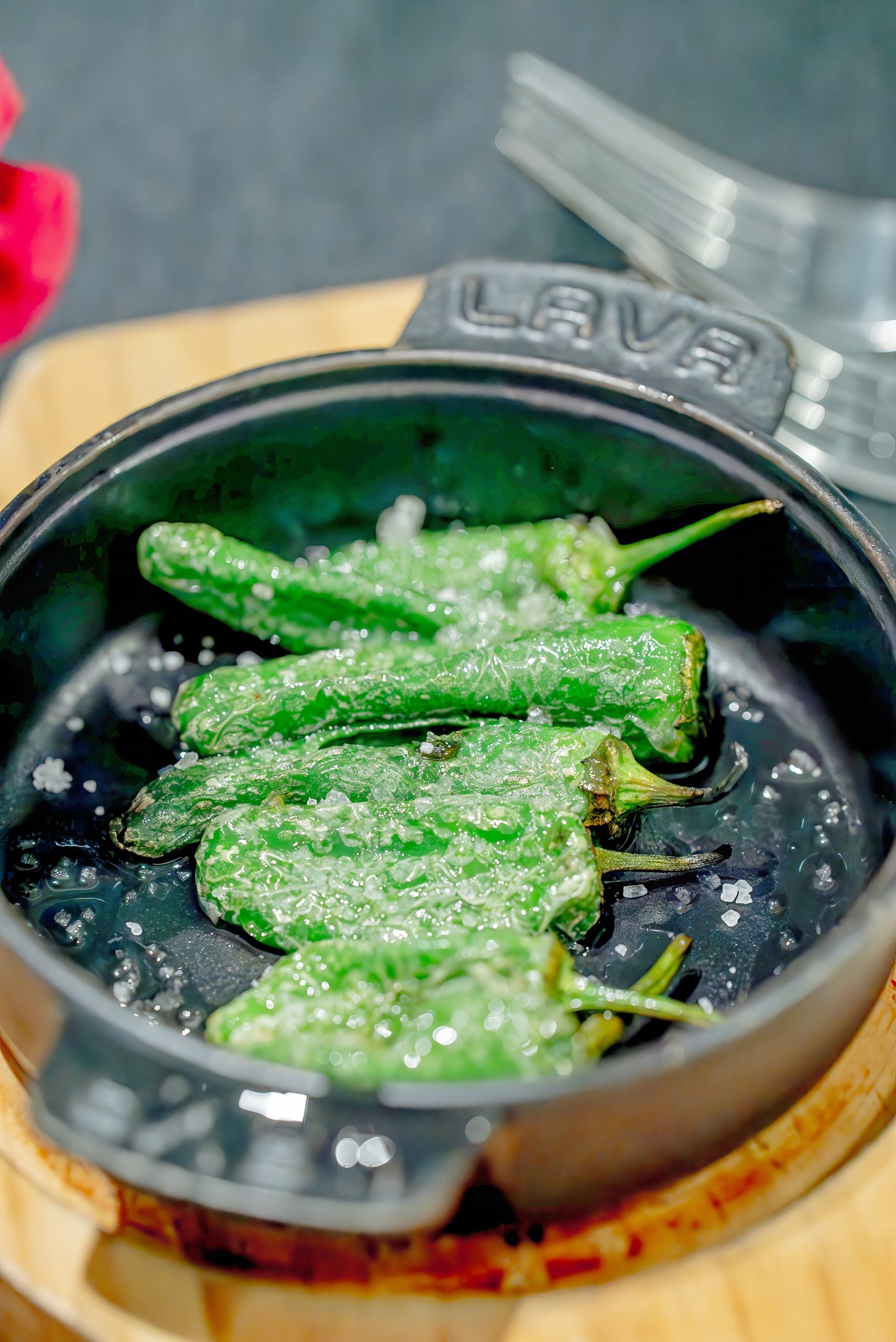 Then, the sharing tapas arrive: Albóndigas, juicy beef meatballs simmered in a rich, slightly sweet tomato sauce; Gambas al Ajillo, plump shrimp sautéed in olive oil with garlic, chilli flakes, and fresh parsley; and Pimientos de Padrón, small green peppers lightly fried in olive oil and sprinkled with sea salt, offering a burst of flavour with each bite.