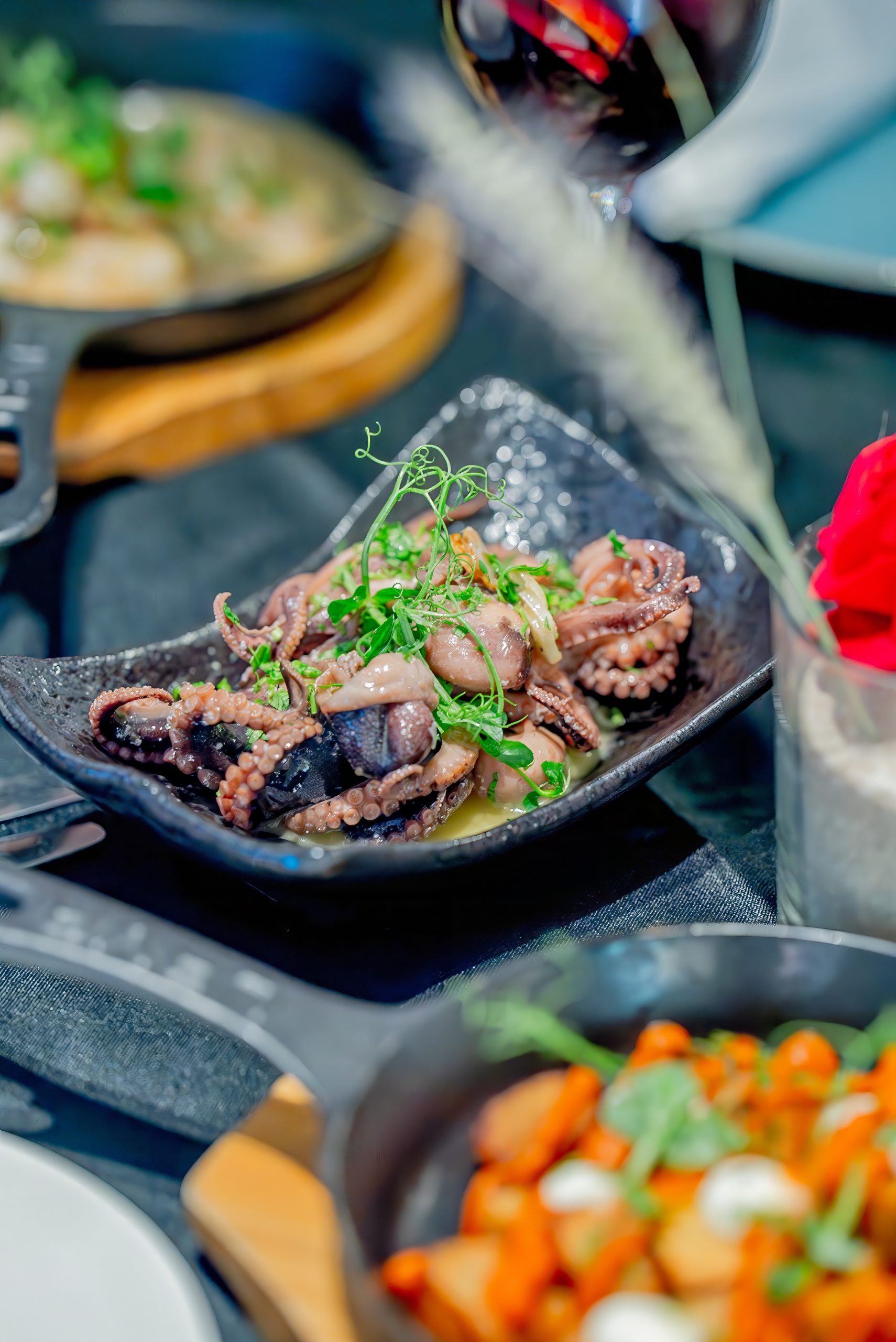 The evening kicks off with a buffet featuring beautifully arranged cheese boards, crusty breads, a fresh seafood selection, and refreshing salads. Once you’ve explored the stations, the set menu begins, showcasing hot sharing plates that bring authentic Spanish favourites to life.