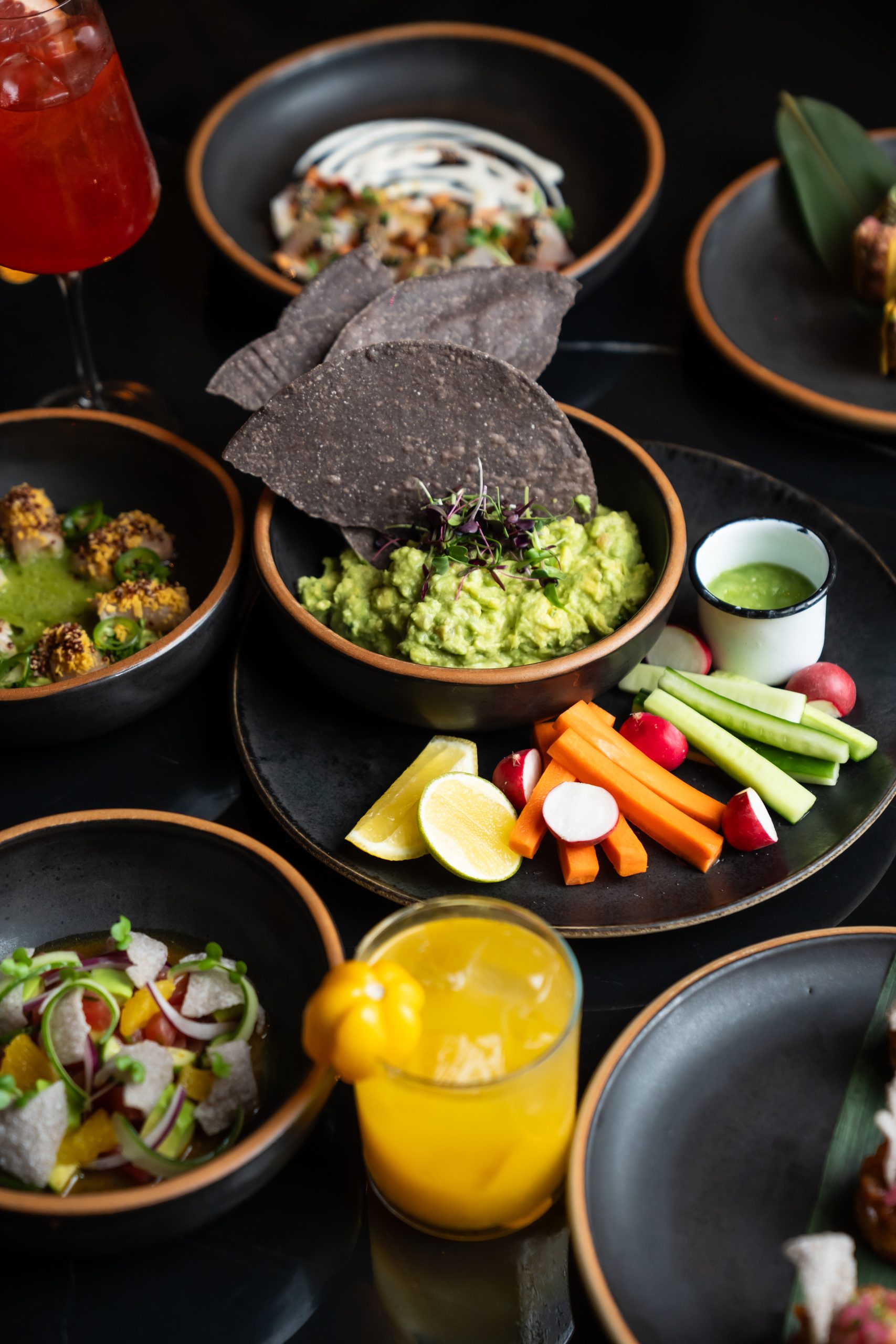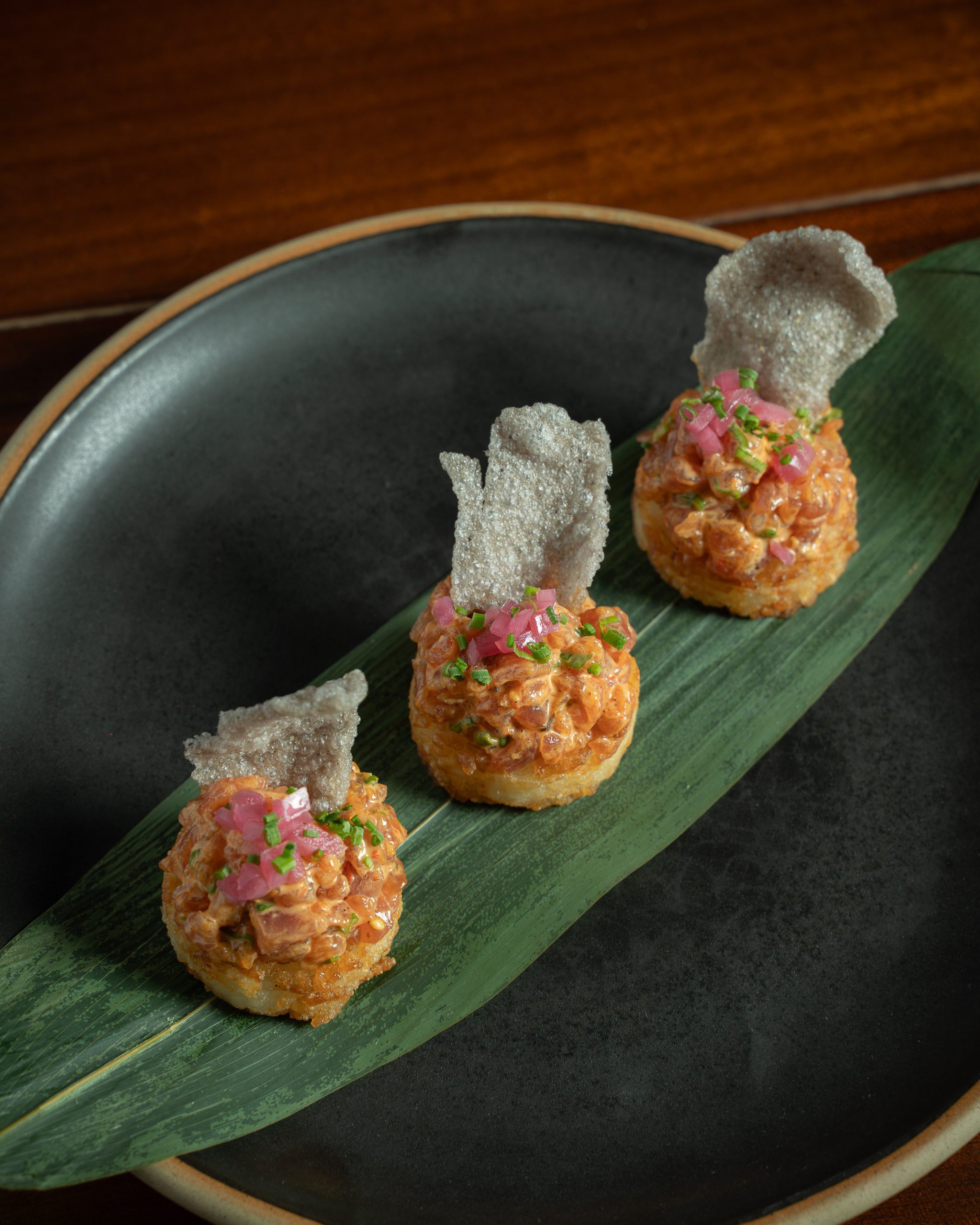 For something more substantial, the three crispy Fish tacos arrive as a generous portion, each soft taco topped with golden-fried seabass, cabbage and pico de gallo, offering satisfying textures. The Wagyu tostada is an indulgent bite. Constructed like a mini club sandwich with flat crisp tortilla chips, it’s packed with richly marbled beef tartare and topped with caviar and chives.