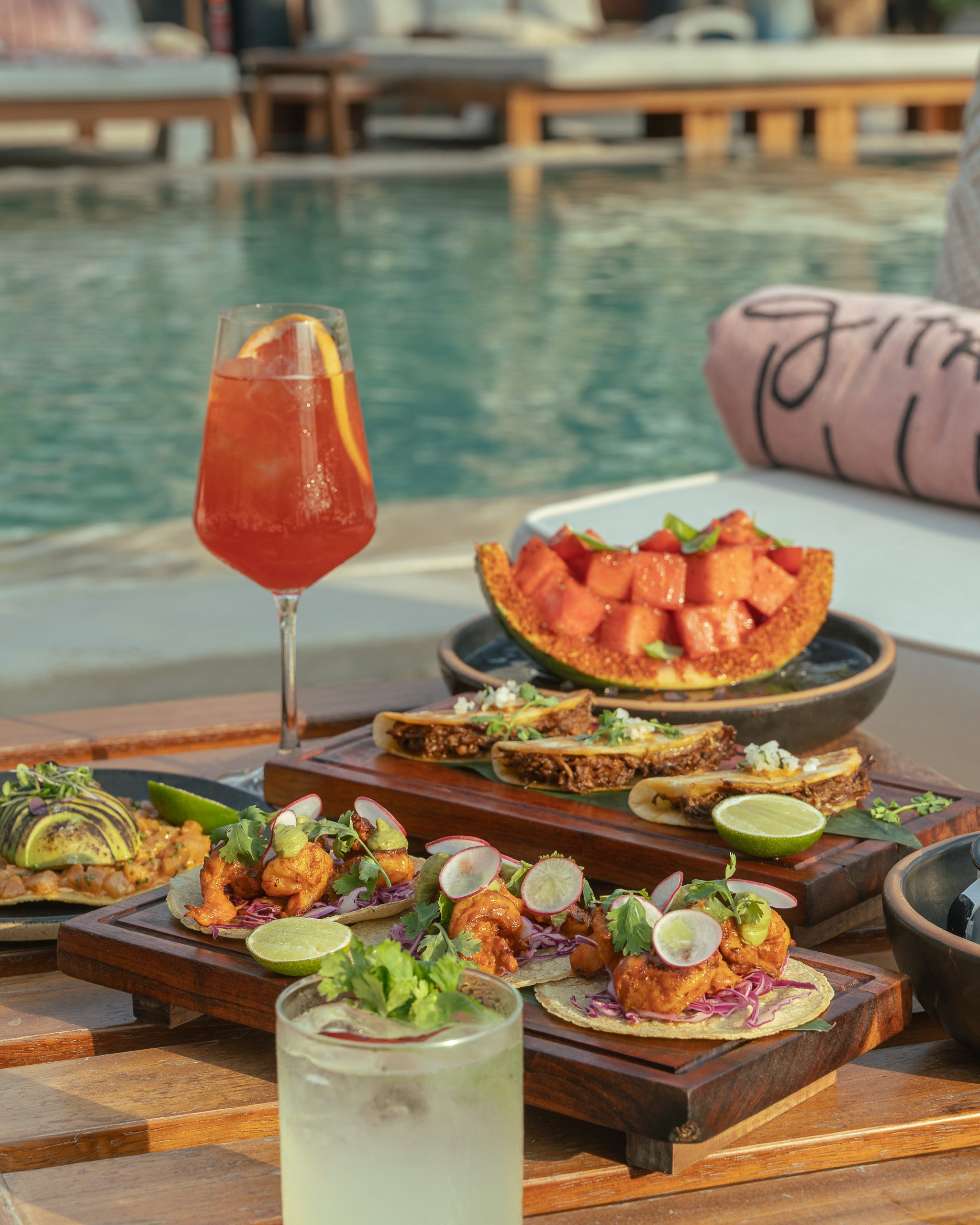We chose a poolside cabana with a table just in front for that toes-in-the-sand feel. Sitting by the pool, our first order was naturally fresh, creamy guacamole with crisp corn totopos. An Heirloom tomato and watermelon salad followed, notably fresh and sweet, sharpened by Fresno chile and tajín. One of our favourites was the crispy Tuna botana featuring creamy yellowfin tuna on crisp rice, spiced with serrano chile and smoky chipotle mayonnaise.