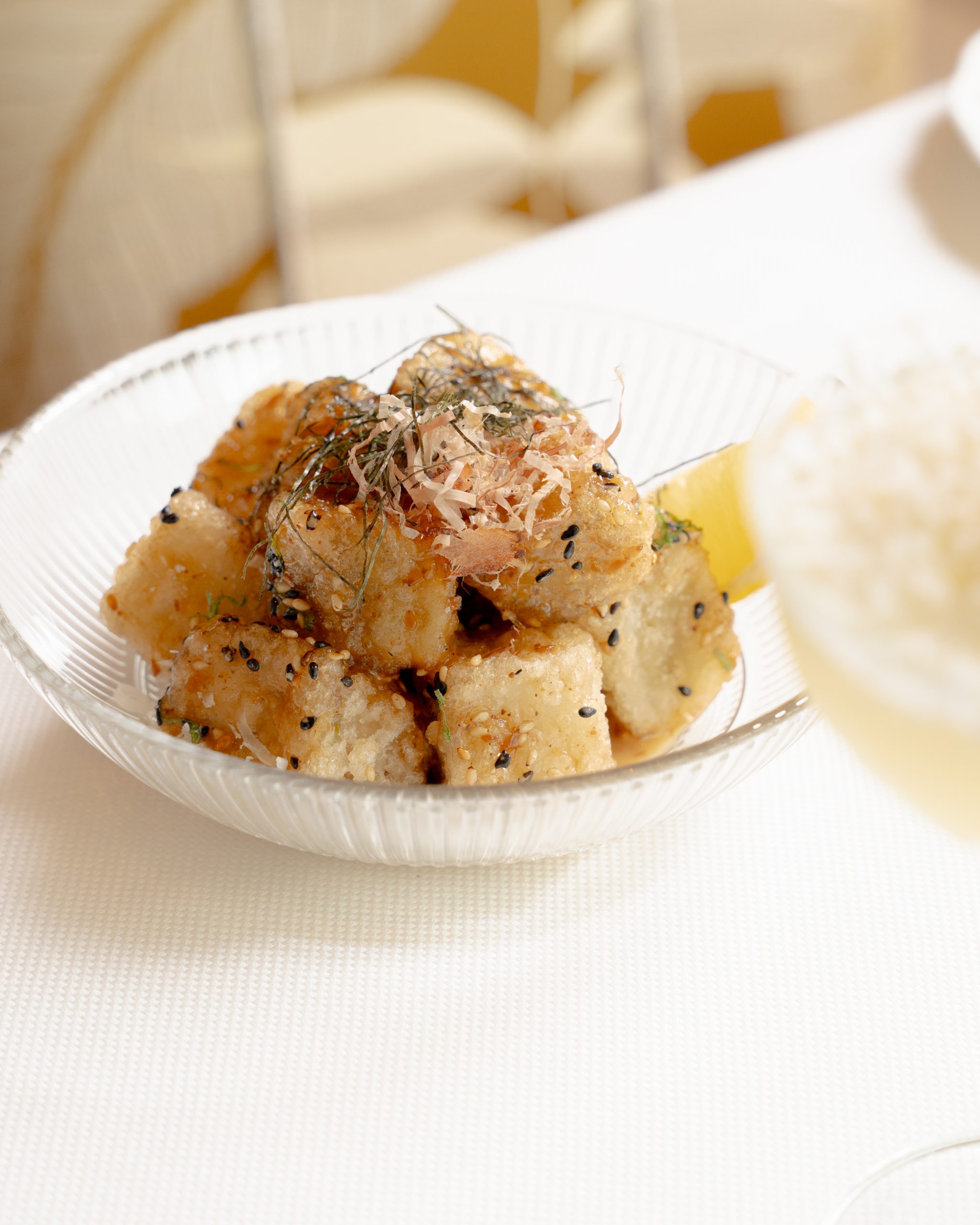 We began with the Aubergine Dengaku, where crisp-edged eggplant met a glossy tahina miso glaze in a beautifully savoury, umami-rich bite. The Mediterranean Pickles offered a bright contrast, each cucumber slice lightly pickled in rice vinegar and yuzu olive oil, with a touch of chilli crisp adding welcome heat. The Mizuna & Parmesan Salad was vibrant and well-balanced, its peppery greens mellowed by a sweet honey mustard dressing and shavings of salty cheese.