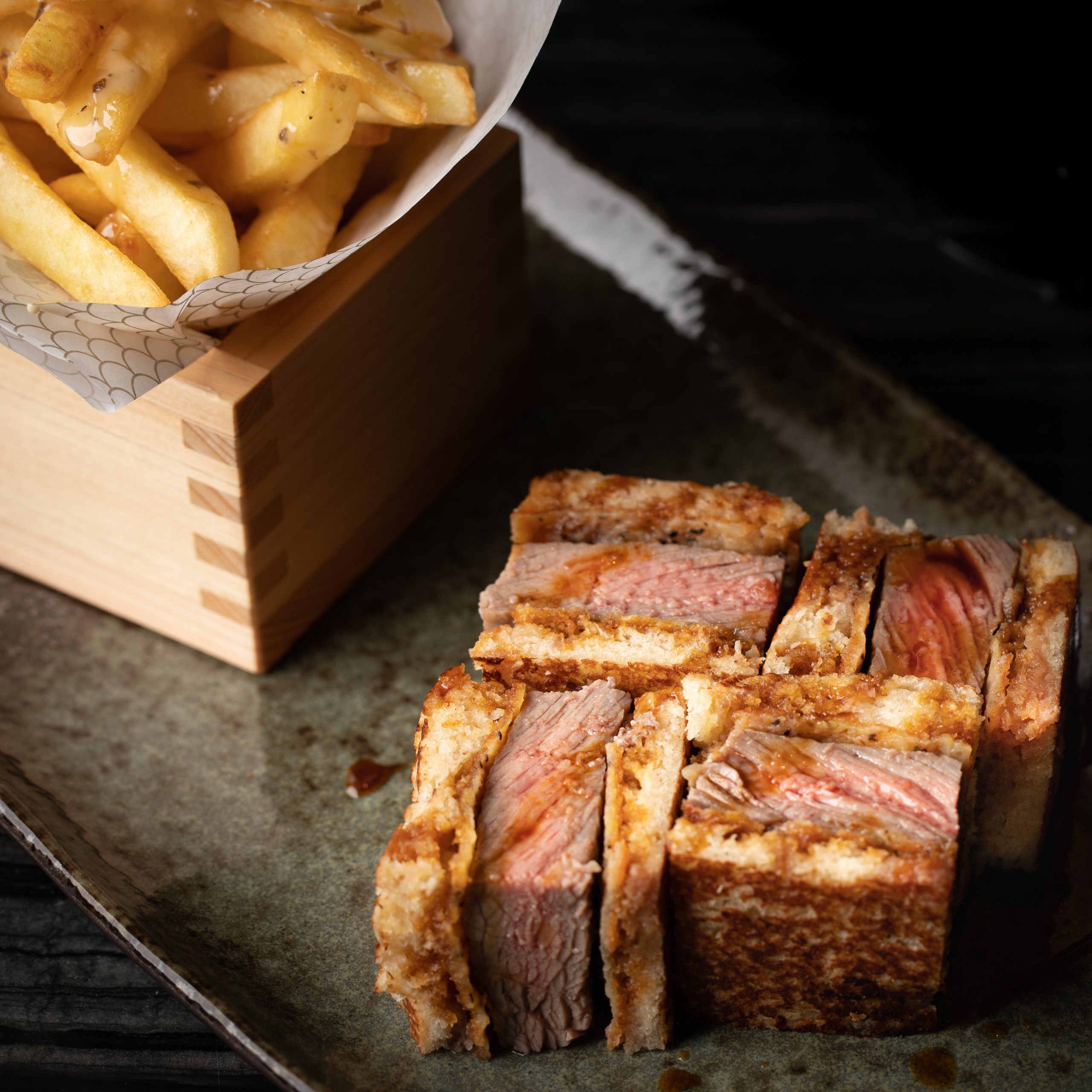 While we waited for our dishes, the resident DJ upped the ante for the remainder of the night with funky tunes. The hearty black cod tucked around a Hoba leaf was tender and cooked to perfection. On the other hand, the Wagyu Sando sandwiched in a home-baked milk bread with a succulent Wagyu fillet in the middle and topped with unagi was exquisite. The fries with creamy true sauce on the side only further amped up the experience.