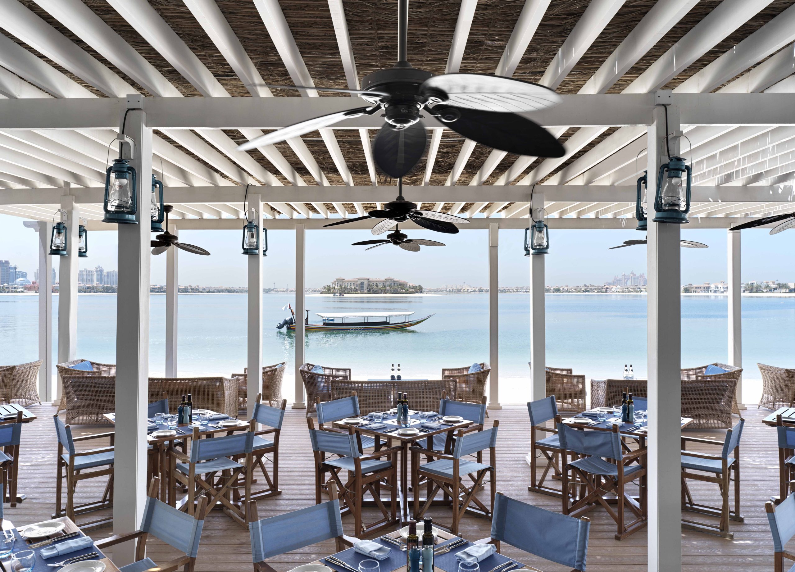 The Beach House at Anantara The Palm feels calm and open, with uninterrupted views across the water from the moment you arrive. We visited during lunch, when the terrace was bathed in soft daylight, and the atmosphere felt easy and laid-back. The interiors lean into a coastal palette of warm wood, woven seating and muted blue accents, framed by a shaded pergola and gently turning ceiling fans. Tables sit on polished wooden decking overlooking the sea, with the resort’s overwater villas stretching out in the distance.