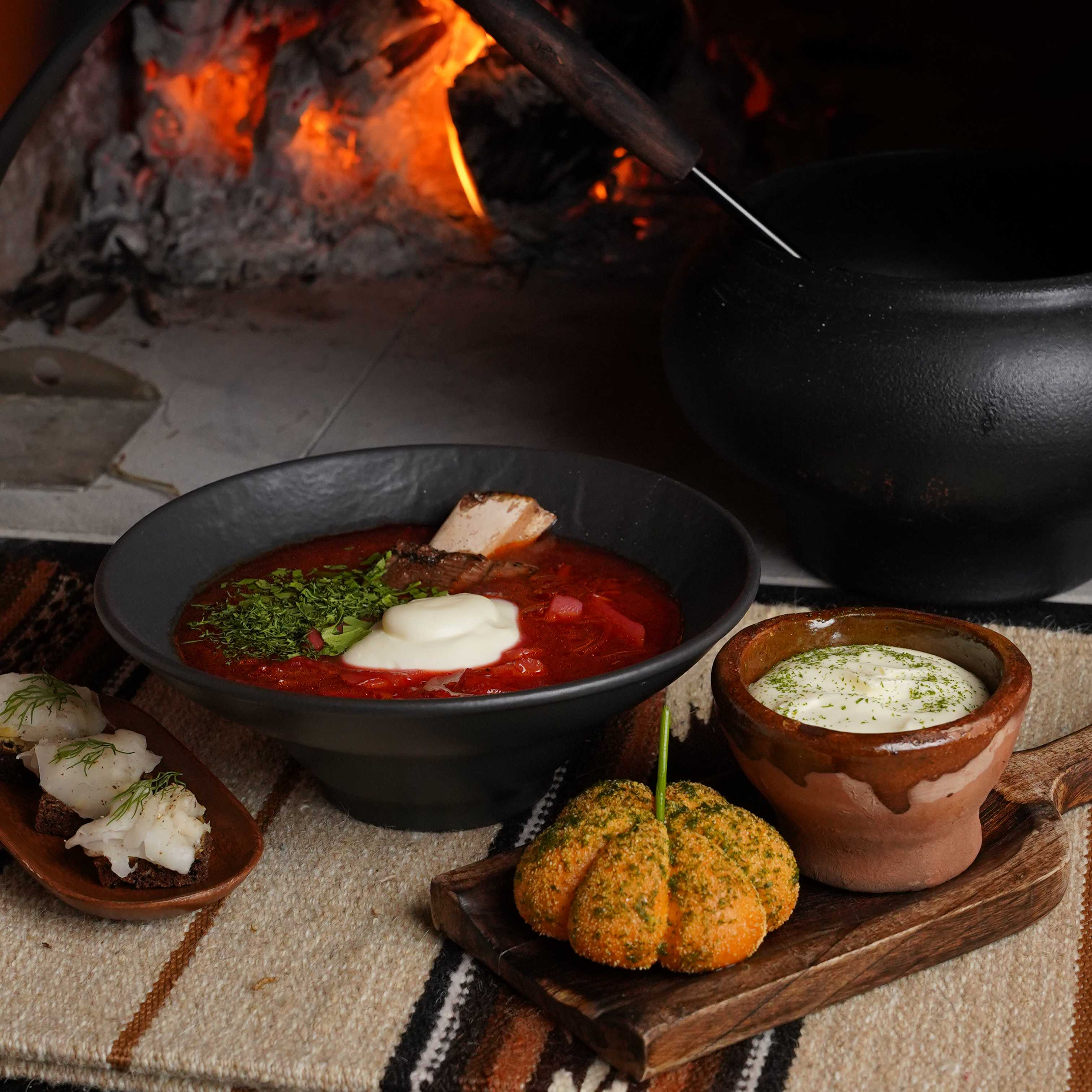 After making our way to the expansive wooden table indoors, we looked through its online menu for an array of dishes with the offerings mainly split into the following sections: cold appetizer, hot appetizer, salad, 1st course, varenyky & galushky, main course, sides, and desserts. Since it was our first-time exploring Ukrainian cuisine, we asked our server for recommendations and opted for the Ukranian canapé and the UNESCO-recognized Borscht as our first course.